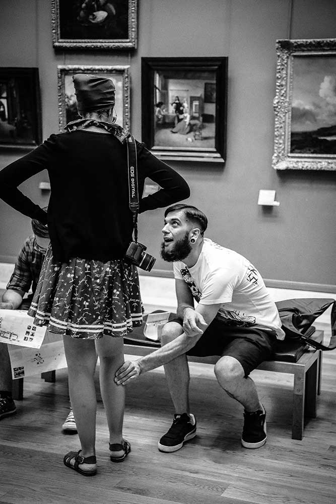 Je vais souvent au musée et à des expositions. Et souvent avec mon appareil photo. Si c’est la première fois mon attention est plus attirée par les œuvres d’art. Si non je regarde avec beaucoup de plaisir les visiteurs car parmi eux on trouve souvent des œuvres de la nature remarquables…